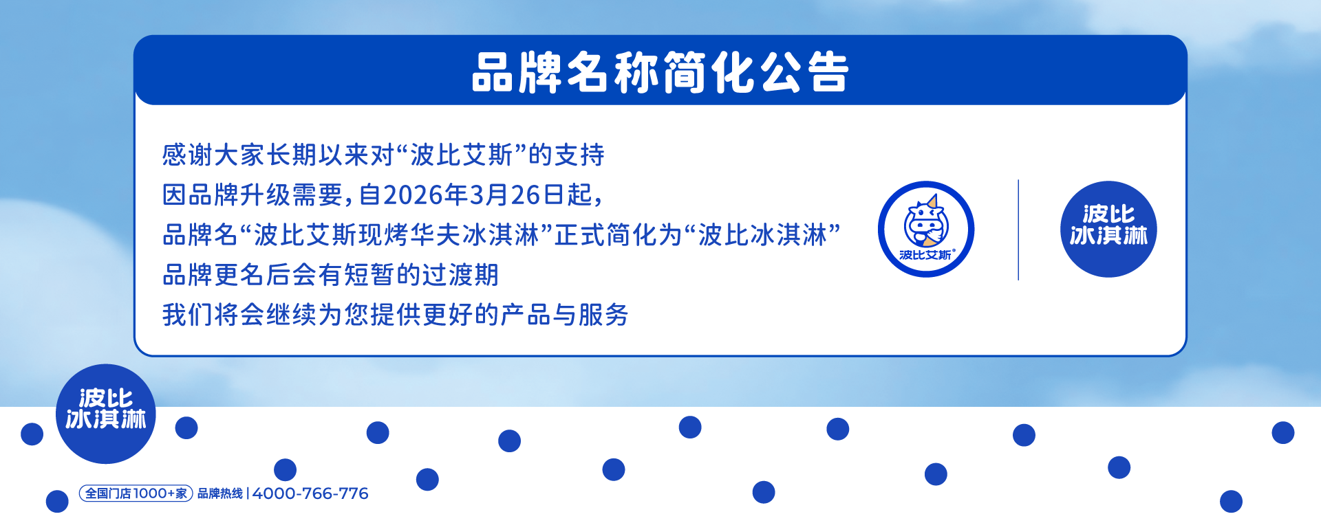 2026年3月,品牌迎来5.0全新升级,品牌名正式由“波比艾斯现烤华夫冰淇淋”简化为“波比冰淇淋”,以更简洁清晰的品牌形象,深耕冰淇淋赛道。